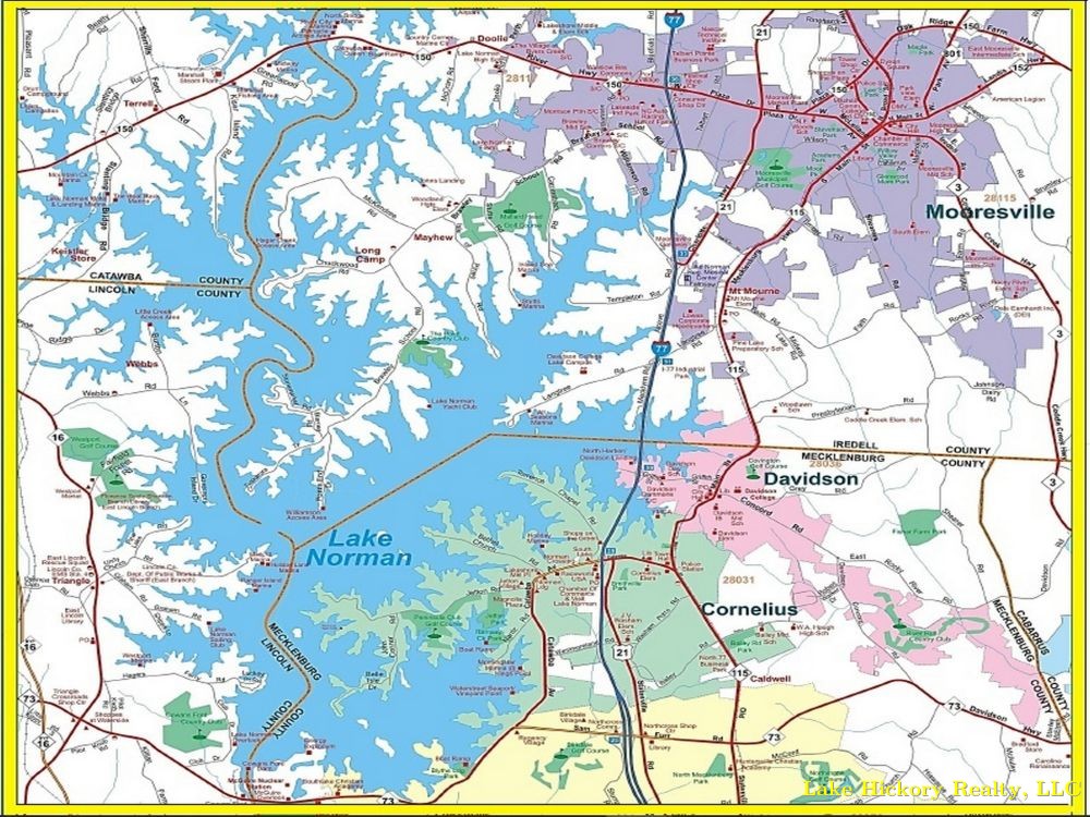 Lake Norman is a hydroelectric lake fed by the Catawba River System, and drains into Mountain Island Lake to the south. It was created in 1963 and named after former Duke Power president Norman Atwater Cocke. Lake Norman is sometimes referred to as the "inland sea" of North Carolina; it offers 520 miles (840 km) of shoreline and a surface area of more than 50 square miles (130 km2). Full pond at Lake Norman is 760 feet (230 m) above mean sea level. Interstate 77 and North Carolina Highway 150 cross Lake Norman at different points. It runs through Iredell, Catawba, Lincoln and Mecklenberg counties.